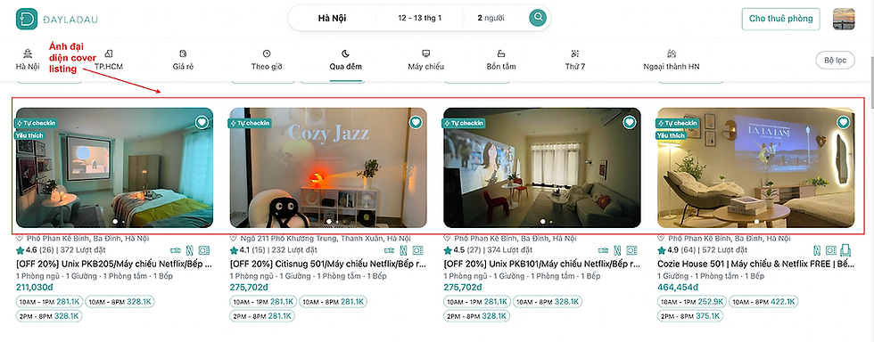 Khi khách hàng tìm kiếm phòng trên Dayladau, hệ thống sẽ trả về danh sách các listing dưới dạng thẻ hiển thị tóm tắt thông tin căn hộ, bao gồm hình ảnh, tên phòng, vị trí, giá, điểm đánh giá và một số chỉ số quan trọng khác. Tại đây, khách hàng thường chỉ mất 5–10 giây để “scan” lướt qua từng listing trước khi quyết định có click vào xem chi tiết hay không.