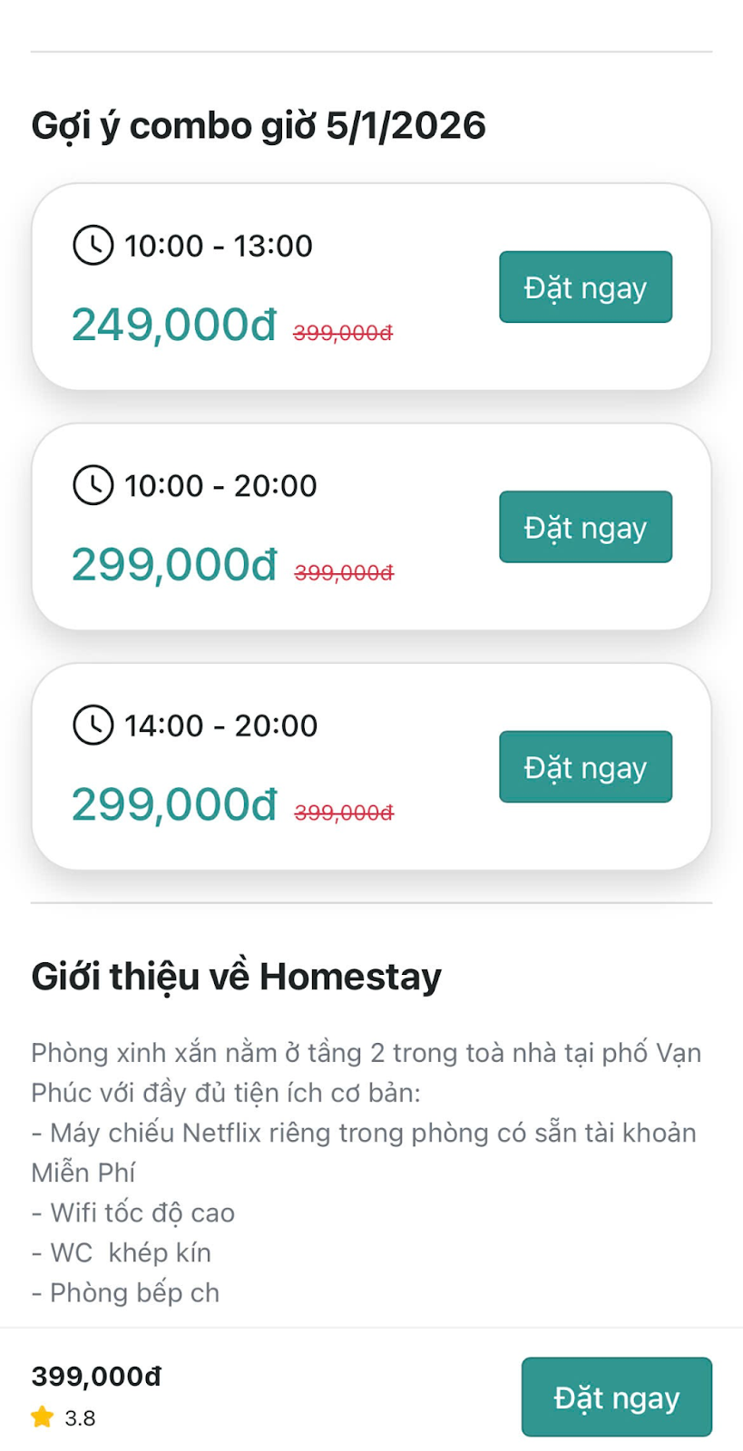 Thông tin combo giờ nên được trình bày rõ ràng để khách hiểu đúng thời gian sử dụng và mức giá. Điều này giúp giảm thắc mắc và tăng khả năng chốt booking nhanh chóng.